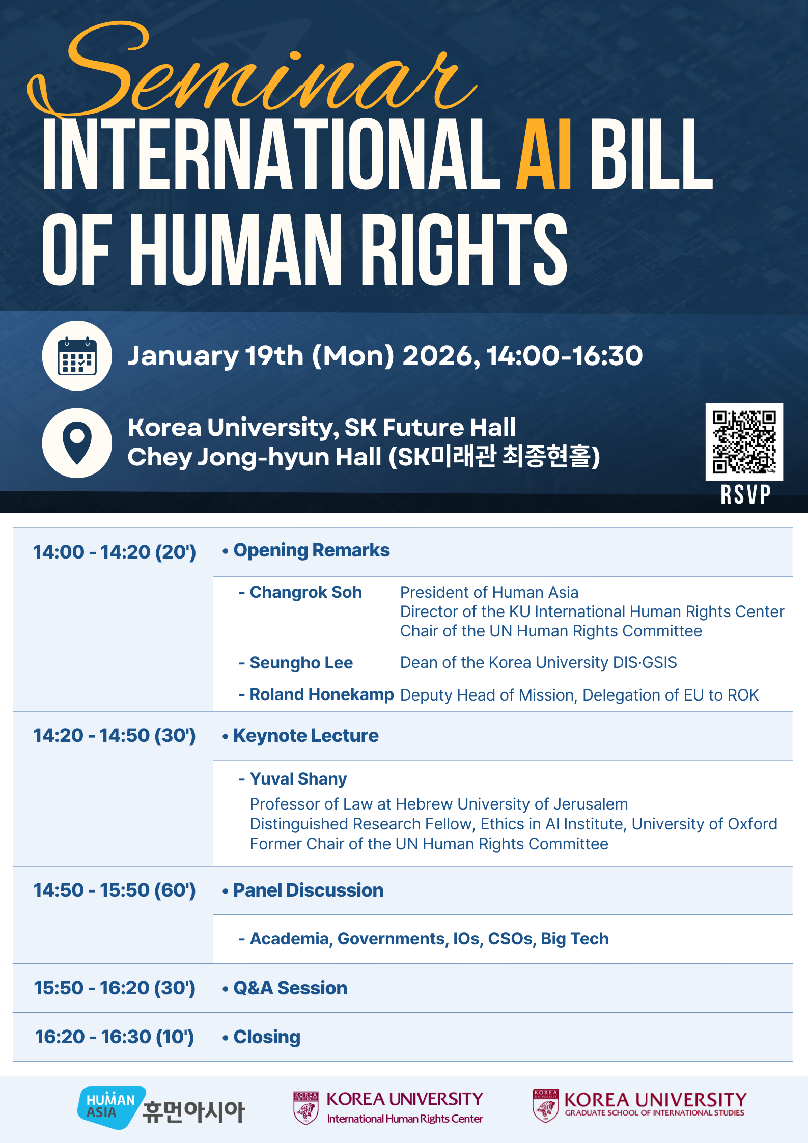 This seminar aims to explore the future directions that the international community should pursue in order to realize an 「International AI Bill of Human Rights」, based on the concepts presented in the White Paper by professor Yuval Shany (Professor of Law at Hebrew University of Jerusalem, Distinguished Research Fellow in the Ethics in AI Institute).