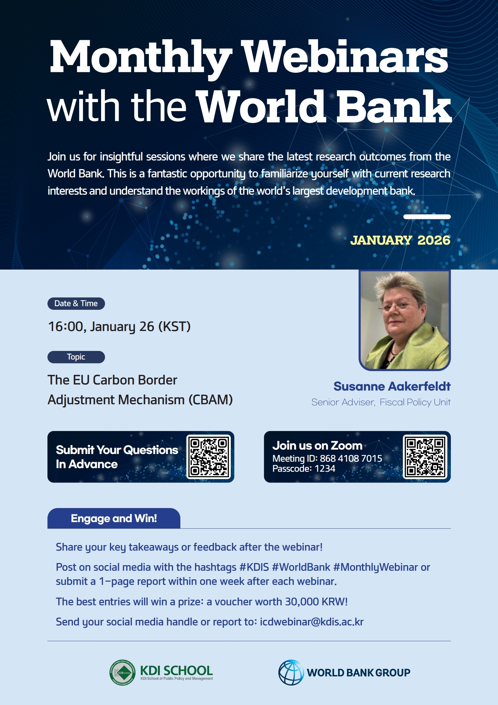 KDI국제정책대학원은 세계은행과 협력하여 저개발국과 개발도상국의 재정정책 및 지속가능한 성장을 위해 다양한 연구사업과 교육훈련사업을 수행하고 있습니다. 본 사업의 일환으로 세계은행에서 수행하는 연구의 성과를 공유하고자 매월 1회의 월례 웨비나를 개최하고자 하오니 학생분들이 많은 관심과 참여 바랍니다.