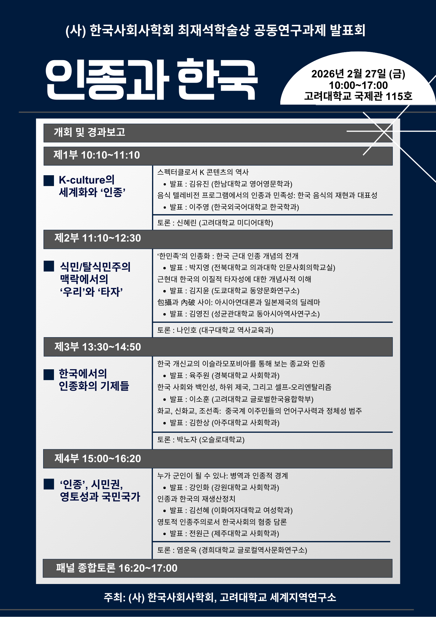 | 제목 | [세계지역연구소] (사) 한국사회사학회 최재석학술상 공동연구과제 발표회 -인종과 한국 |