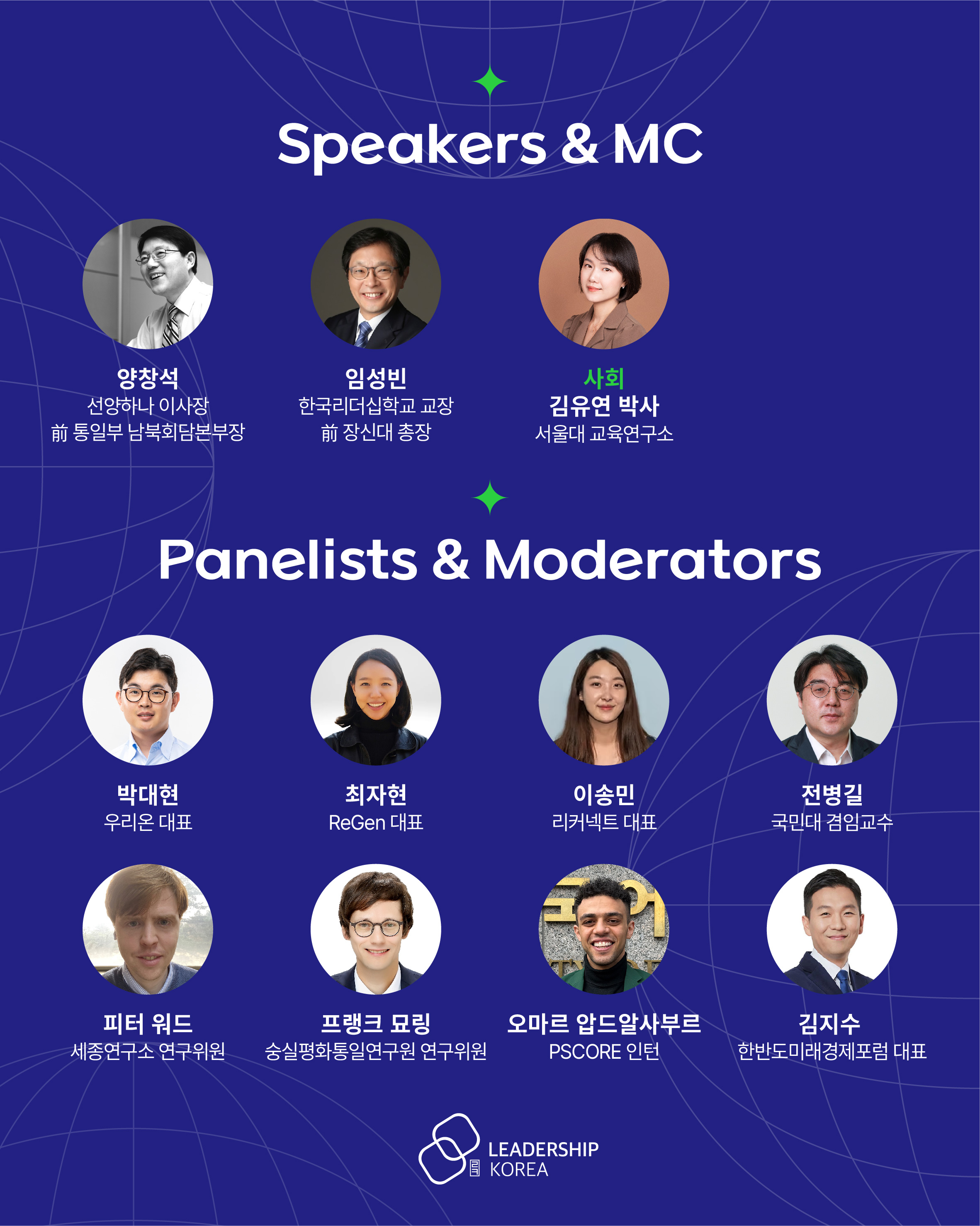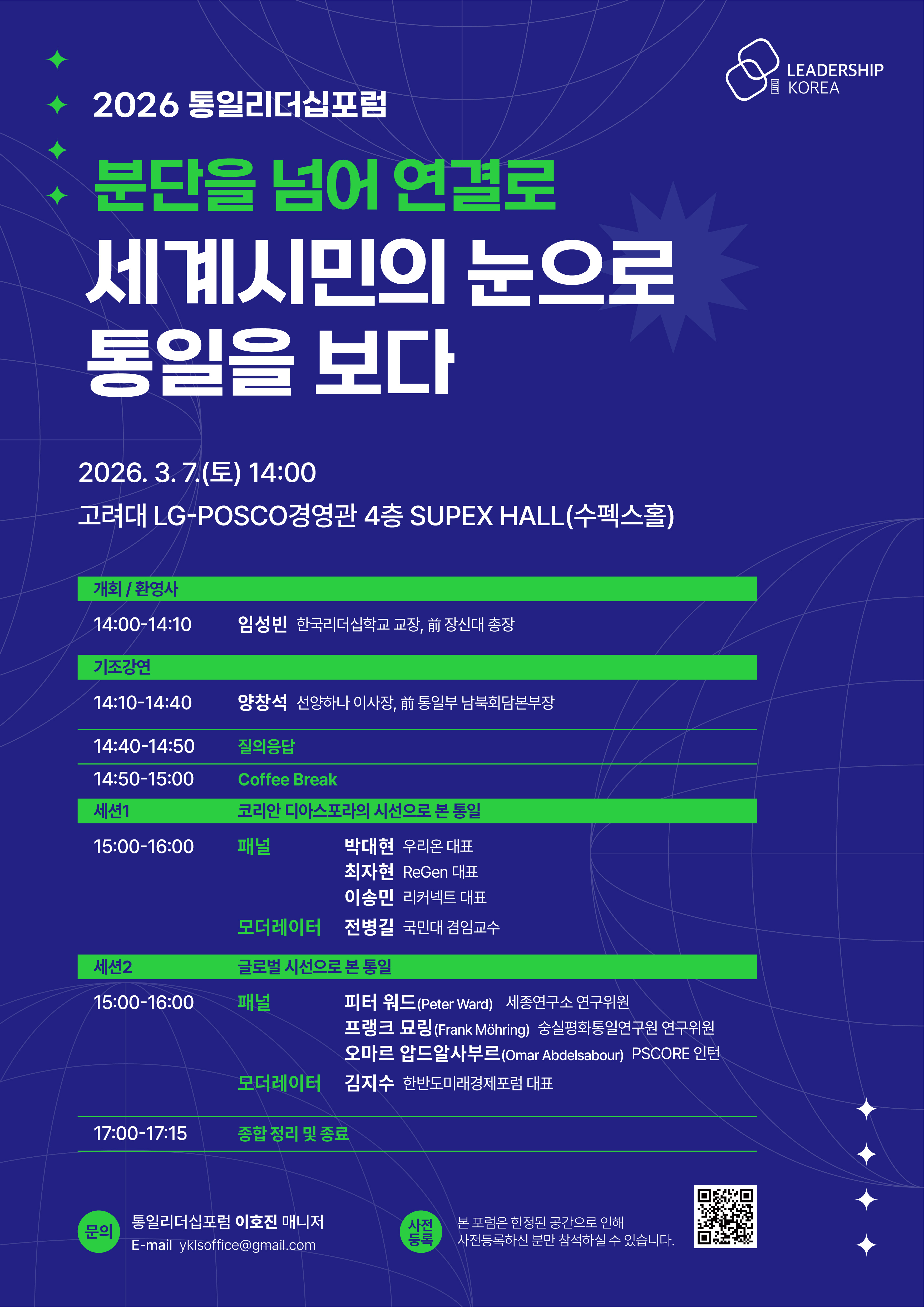 안녕하세요. 사단법인 리더십코리아/한국리더십학교입니다. 저희는 2001년 문을 연 이래로, 대한민국을 이끌어갈 미래의 주역들을 키우고 다가올 통일한국을 꿈꾸며 정성껏 준비해 왔습니다. 요즘 세상이 참 빠르게 변하고 있지요? 하지만 안타깝게도 한반도는 80년이라는 긴 시간 동안 여전히 높은 분단의 벽과 낡은 이념의 틀에 갇혀 있는 것이 현실입니다. 우리가 꿈꾸는 평화는 화려한 외교적 수사보다는 따뜻한 '관계'에서 시작된다고 믿습니다. 통일 또한 우리네 '삶의 현장'에서 먼저 싹터야 하지 않을까요? 그동안 전 세계 곳곳에 뿌리 내린 코리안 디아스포라와 국내외 세계 시민들은 평화와 통일 논의에서 소외되어 있었습니다. 이번에 마련한 <2026 통일리더십포럼>은 "분단을 넘어 연결로: 세계시민의 눈으로 통일을 보다"라는 주제로, 흩어져 있는 디아스포라의 마음을 하나의 네트워크로 잇는 소중한 자리가 될 것입니다. 한반도의 새로운 미래를 함께 그려가는 이 설레는 여정에 여러분을 초대합니다.