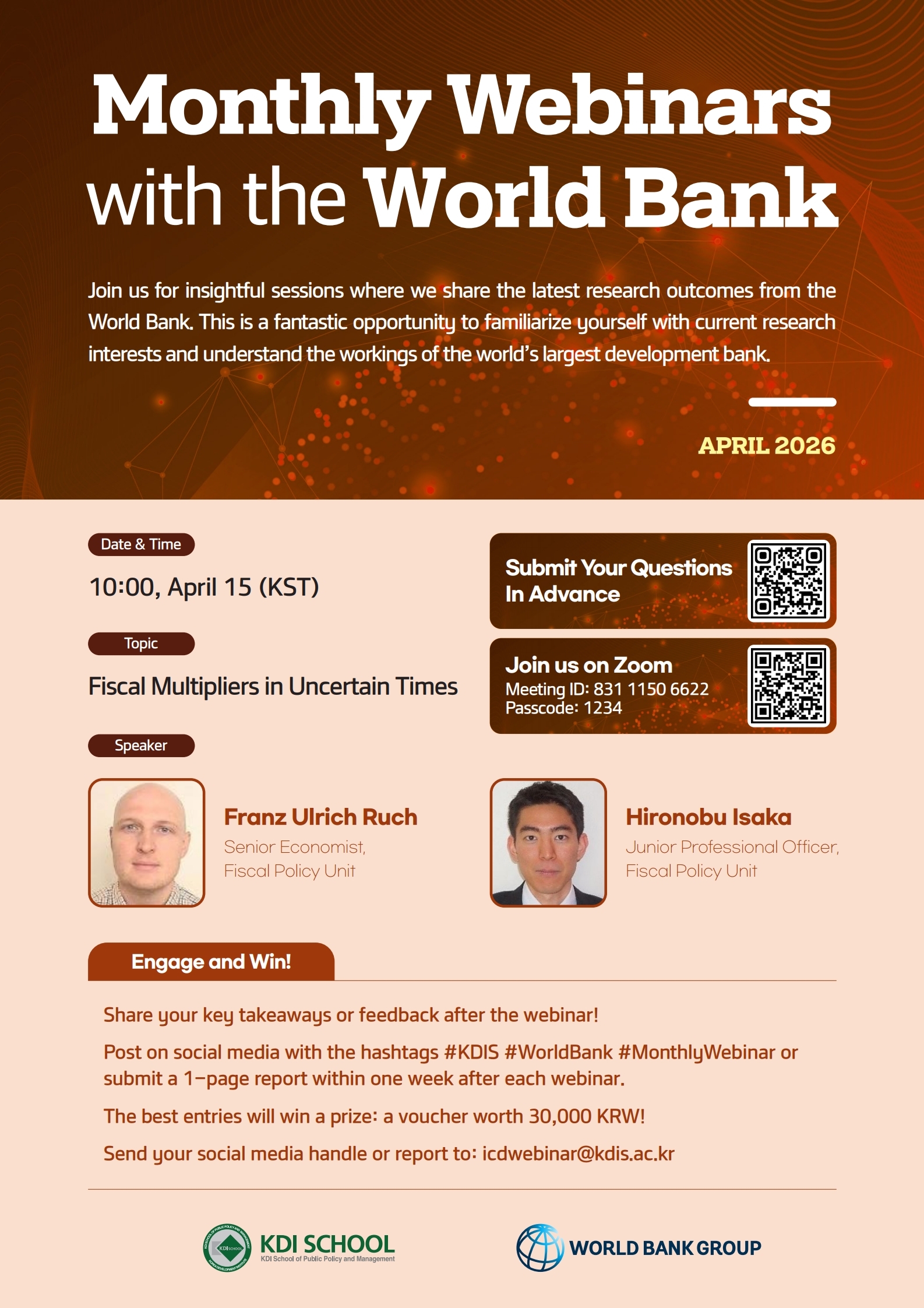 KDI국제정책대학원은 세계은행과 공동으로 협력대상국의 재정정책 및 지속가능한 성장을 위해 다양한 연구사업과 교육훈련사업을 수행하고 있습니다. 본 사업의 일환으로 세계은행에서 수행하는 연구의 성과를 공유하고자 매월 1회의 월례 웨비나를 개최하고자 하오니 학생들의 많은 관심 바랍니다.