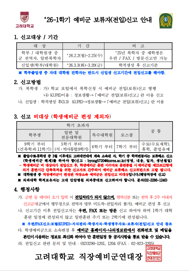 | 제목 | 2026-1학기 학생예비군 보류자(전입) 신고안내 |